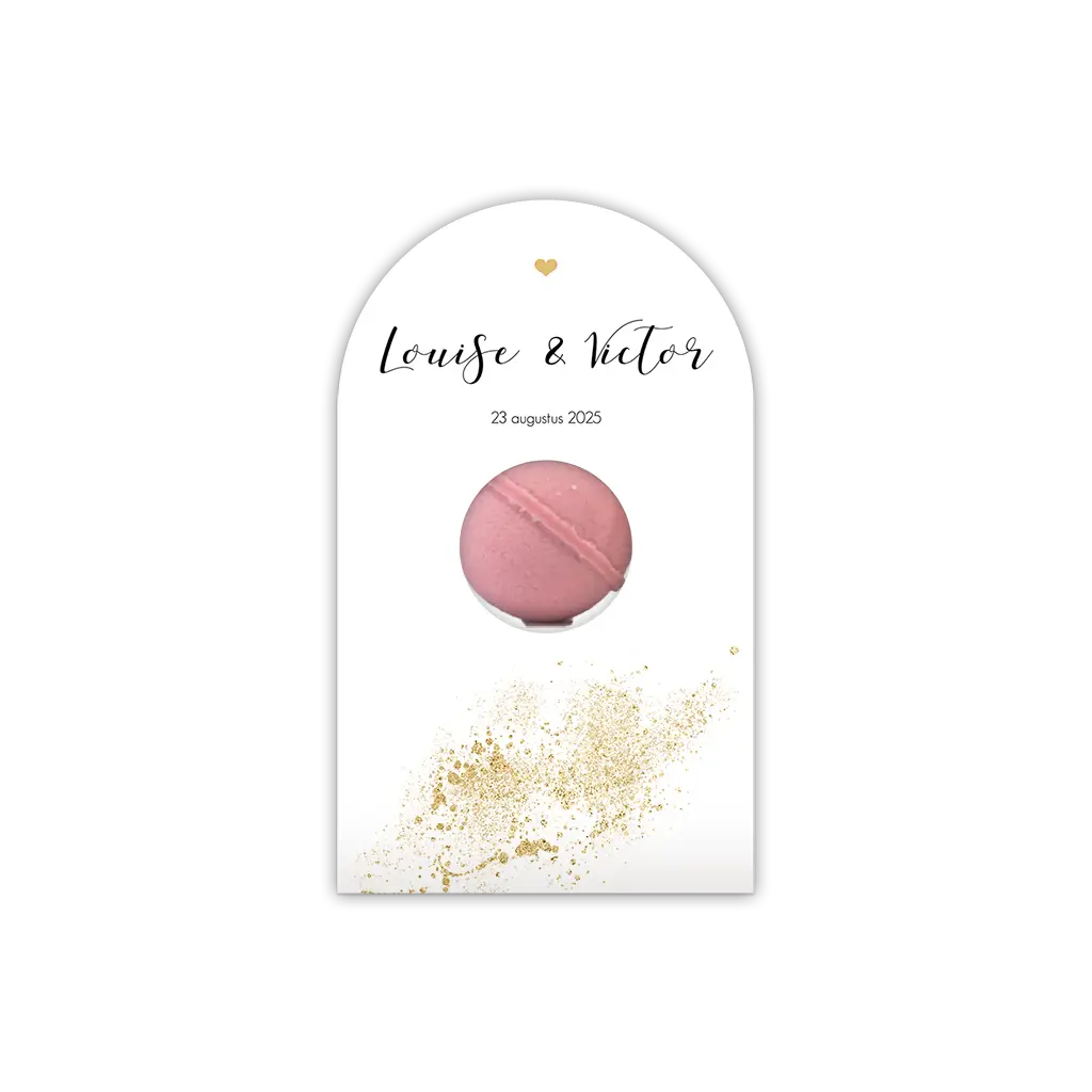 Deze boogvormige geschenkverpakking met gouden verfspetters voegt een sprankelende touch toe aan elk cadeau. De sierlijke letters en het hartje erboven maken het geheel af, terwijl de ronde uitsnede ervoor zorgt dat je het gastengeschenk deels kunt zien.