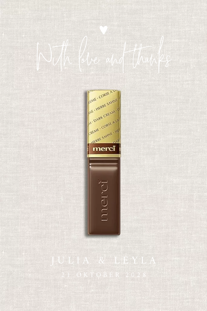 Geef de gasten van jullie bruiloft een leuk geschenk met chocola. Op dit kaartje in linnen-look staat de tekst in roségoudfolie.