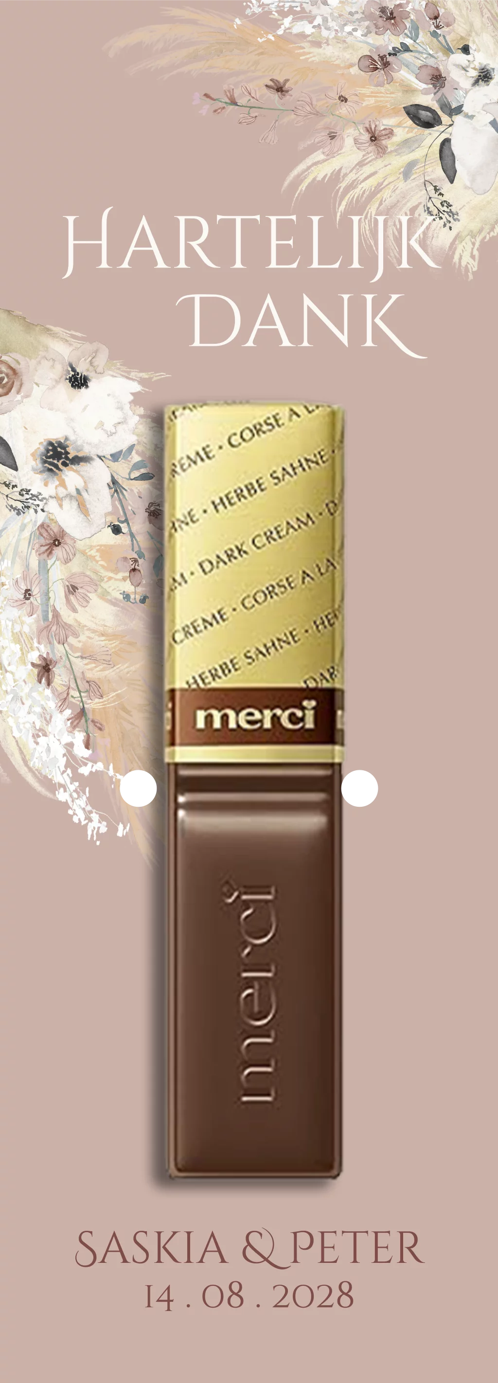 Geef de gasten van jullie bruiloft een leuk geschenk met chocola. Het oudroze kaartje heeft het bloemendesign.