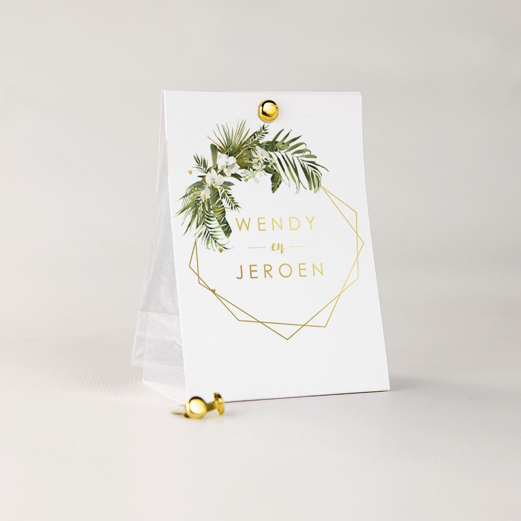 Tentkaartje bedankje met geometrisch design, palmbladeren en goudfolie