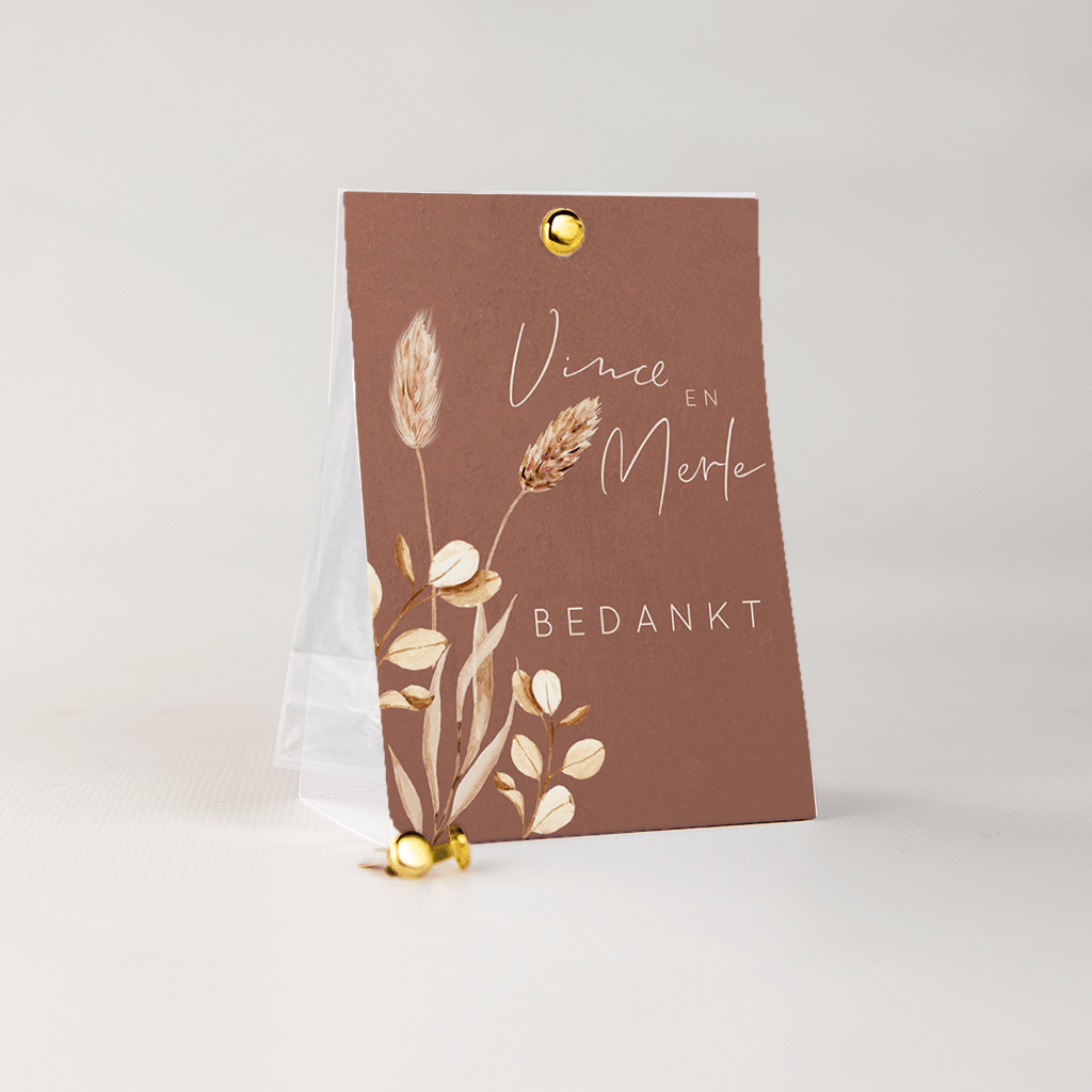 Tentkaartje bedankje met takjes en bruinrode velvet achtergrond.