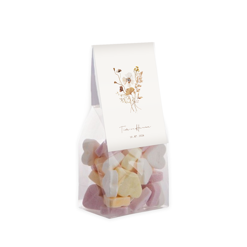 Verras jullie bruiloftsgasten met een leuke attentie, verpakt met dit vouwkaartje in stijl van de trouwkaart. Op de pastelachtergrond staat een veldboeket in zachte natuurtinten.