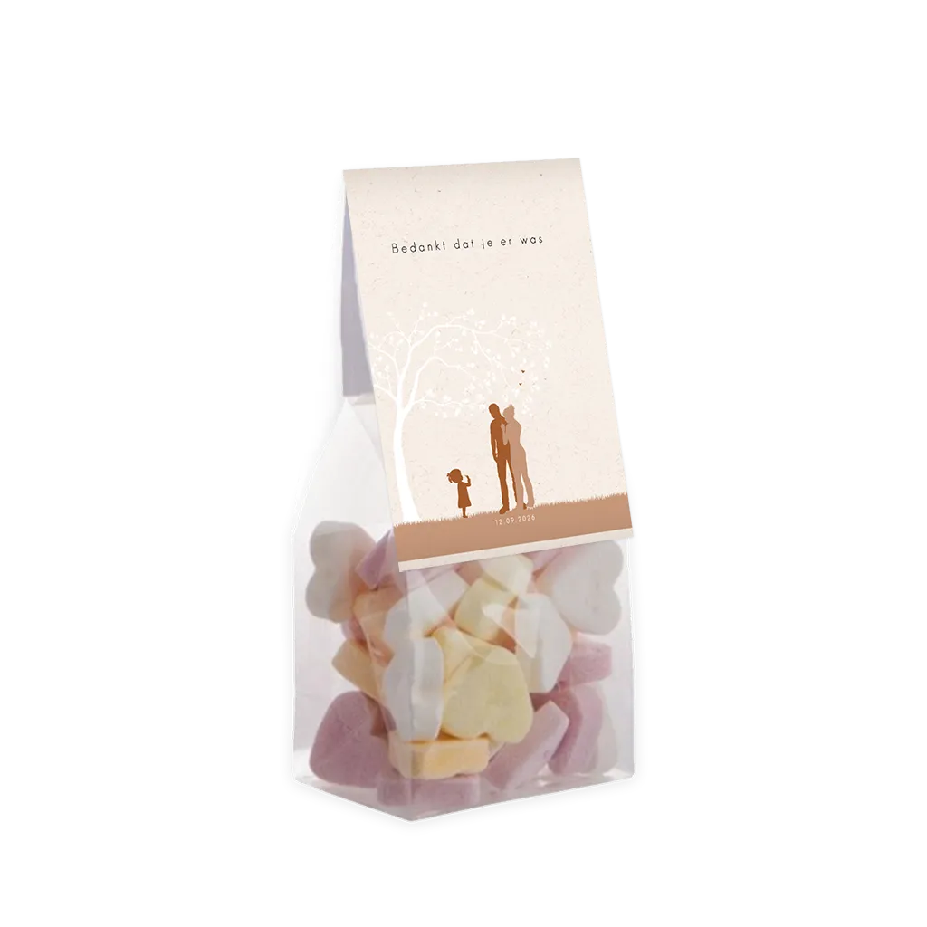 Mooi vouwkaartje voor de gastgeschenkjes, met het design van een familie in silhouet onder een boom.