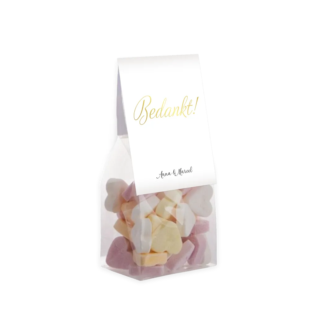 Stijlvol vouwkaartje om de bedankjes voor jullie bruiloftsgasten in te verpakken, op het witte kaartje staat de tekst in luxe goudfolie.