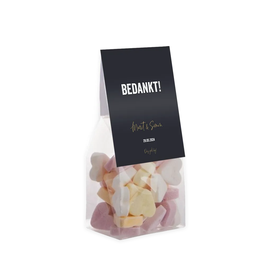 Modern vouwkaartje in zwart wit in stijl van de trouwkaart, als verpakking voor een bedankje voor jullie bruiloftsgasten.