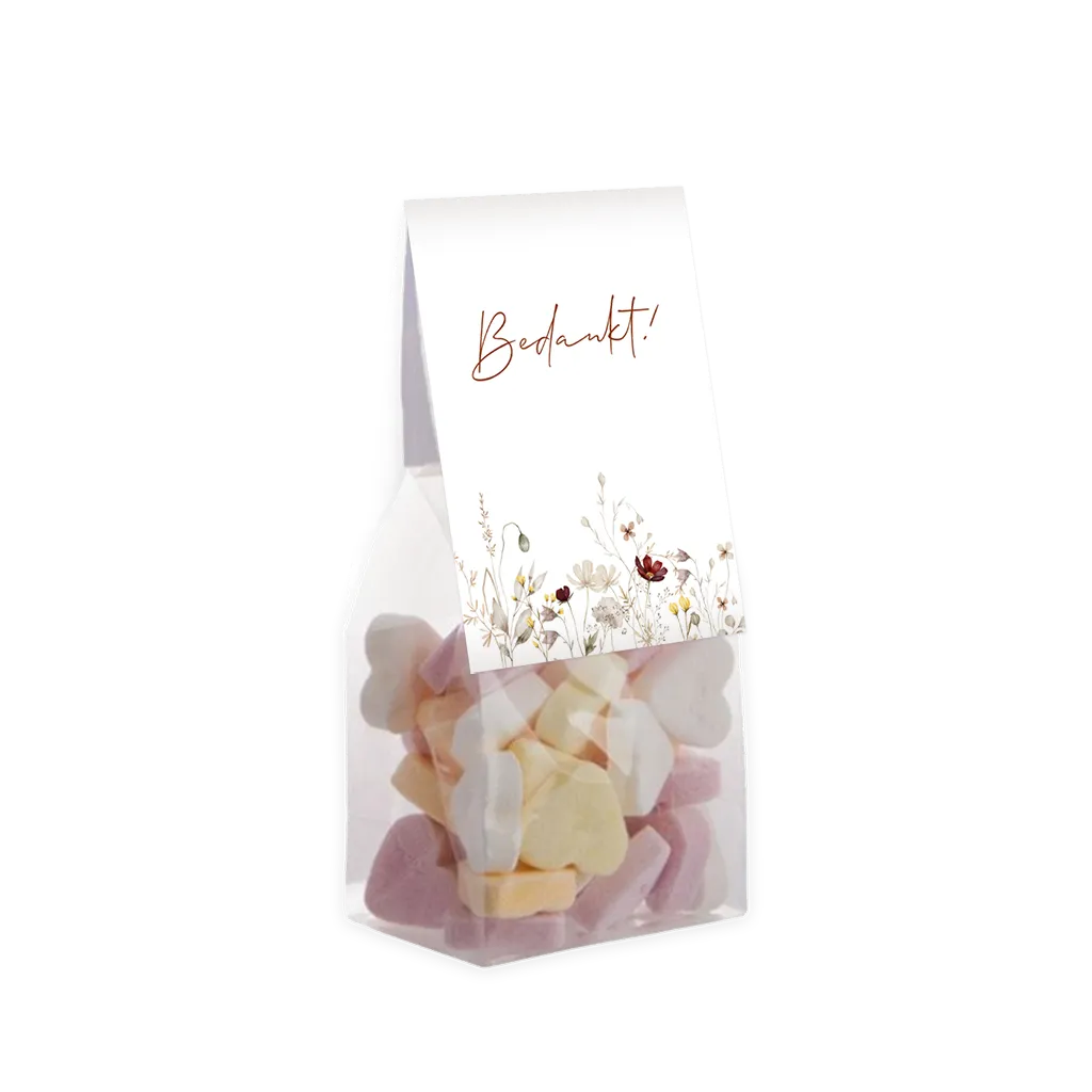 Stijlvol vouwkaartje voor de bedankjes van jullie bruiloft. Het kaartje is helemaal in stijl met de trouwkaart met onderaan een rand veldbloemen.