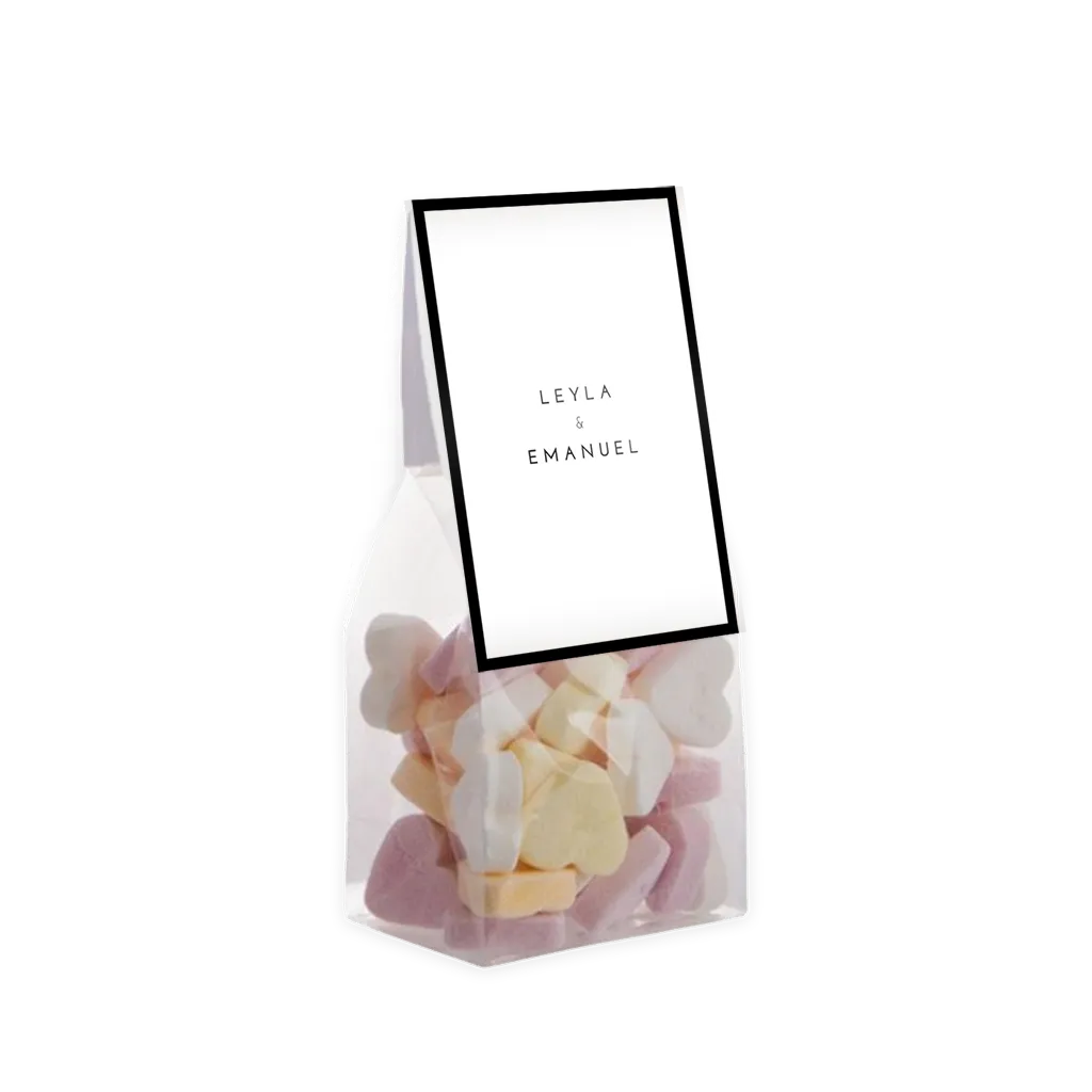 Handig vouwkaartje als verpakking van de gastgeschenkjes, helemaal in stijl van de trouwkaart in zwartwit met goudfolie.