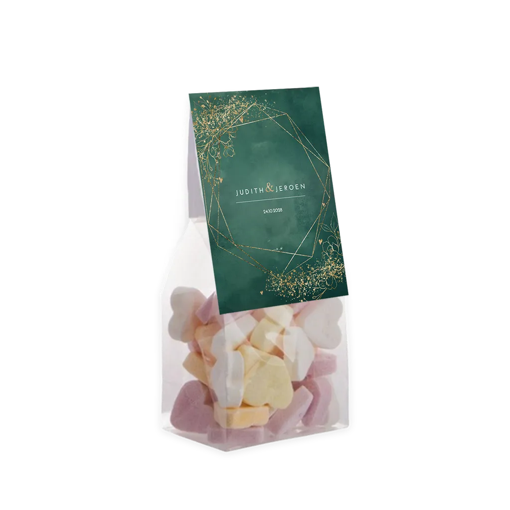 Vouwkaartje in stijl van de groene trouwkaart met goudkleurige tekening van lijnen, confetti, bloemen en hartjes.