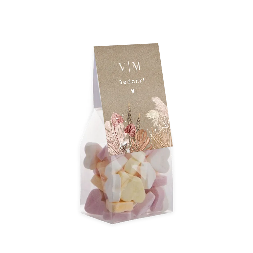 Vouwkaartje als cadeauverpakking in stijl van de kraft trouwkaart met droogbloemen. Onder de initialen staat 'bedankt' met een hartje erbij.