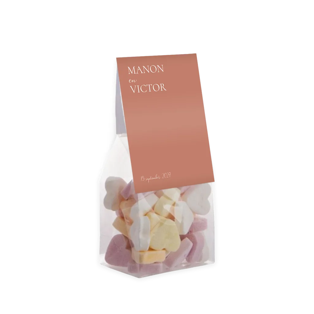 Een vouwkaartje als geschenkverpakking, helemaal in stijl van de roestbruine trouwkaart met witte typografie.