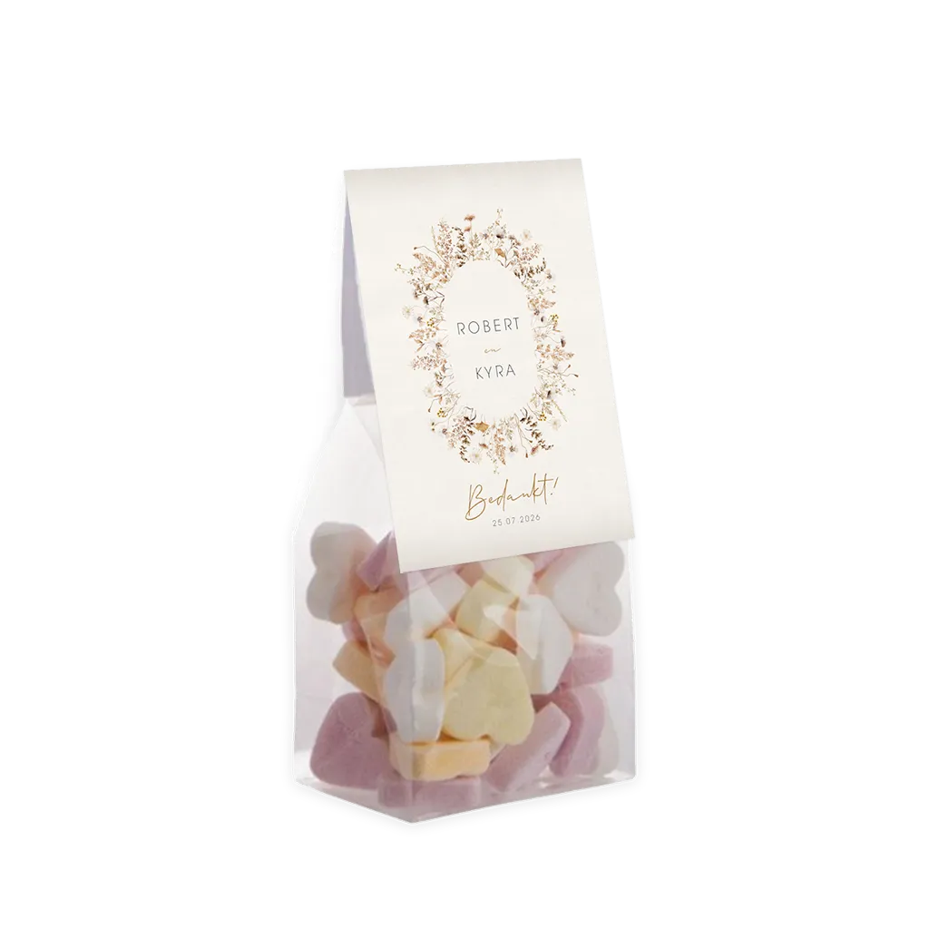 Leuk vouwkaartje als verpakking voor de gastgeschenkjes, helemaal in stijl van de vintage trouwkaart met bloemenkrans.
