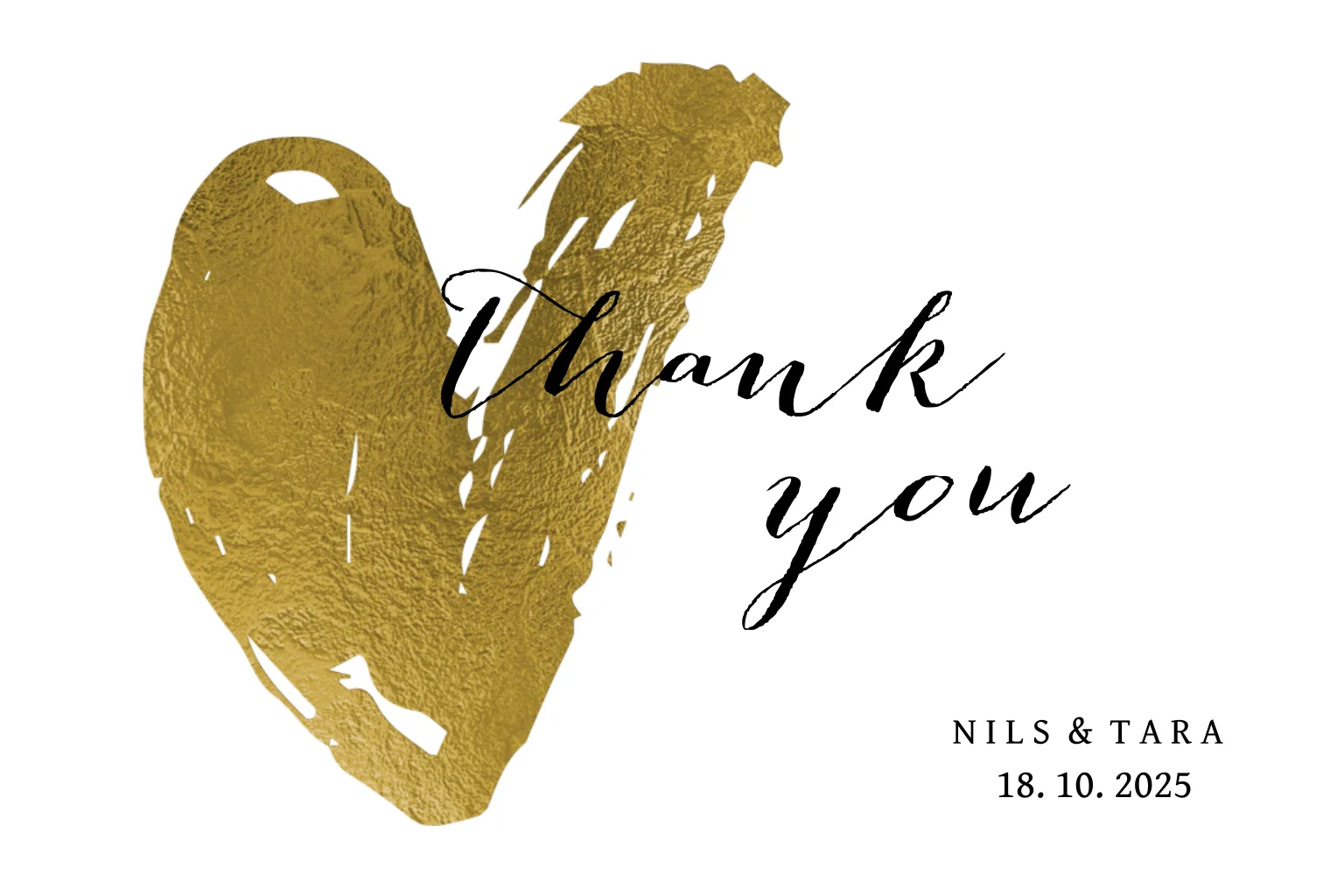 Deze hippe kaart met lief, groot hart is leuk om jullie bruiloftsgasten te bedanken. De tekst 'Thank you' loopt mooi door uit het hart en maakt dit een unieke kaart. Op de achterkant staat ook nog een goudkleurige verfstreep achter de tekst. Pas de teksten aan in de online editor en de kaart is klaar voor verzending!