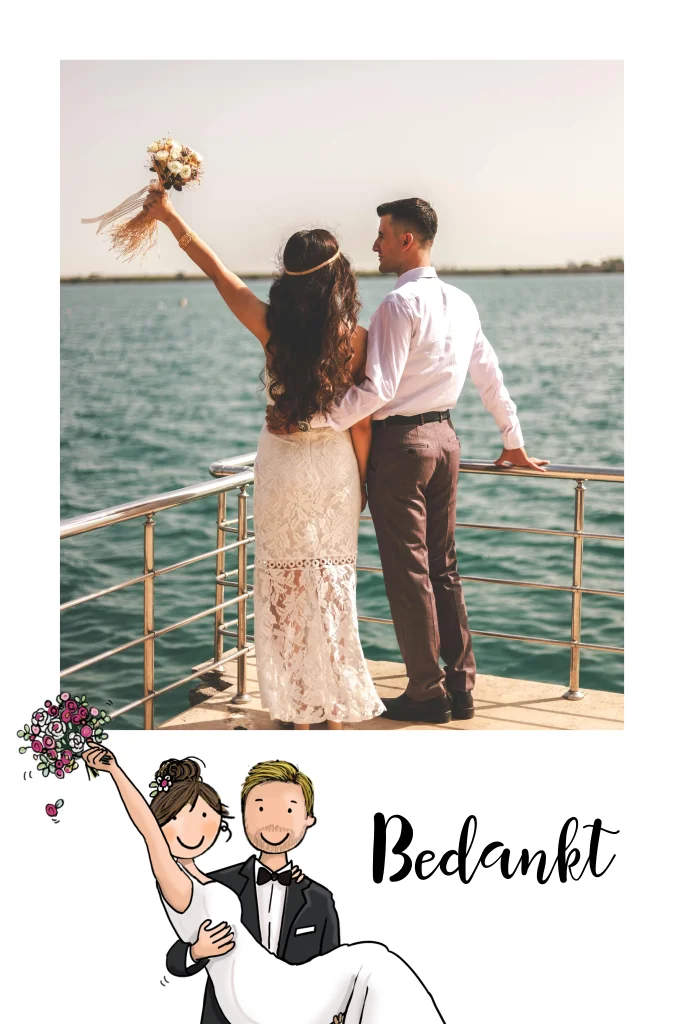 Bedank de gasten van jullie bruiloft met deze vrolijke bedankkaart. Op de voorzijde kun je een mooie foto uploaden.