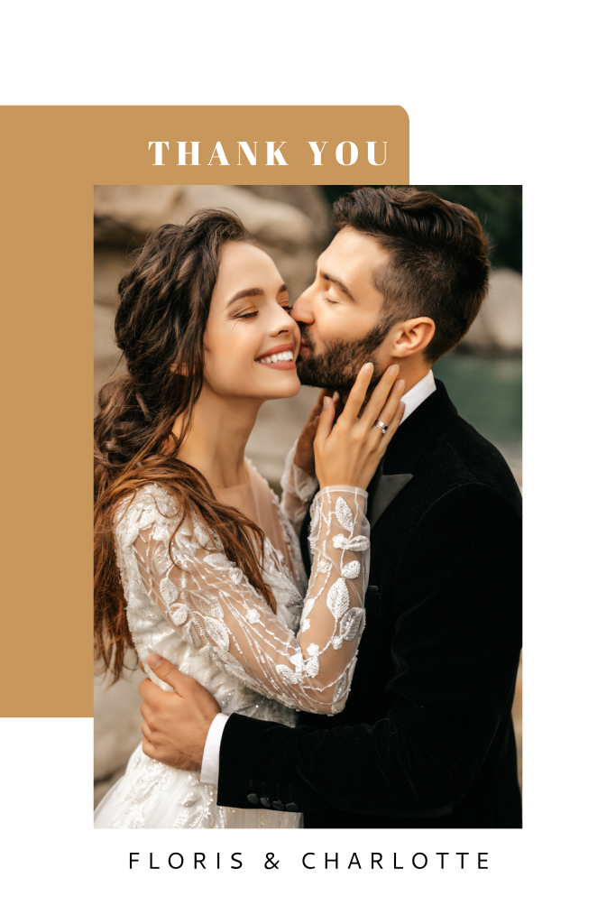 Bedank de gasten van jullie bruiloft met deze persoonlijke bedankkaart, op de voorzijde is ruimte om een mooie foto te uploaden. Achter de foto staat een okergeel vlak met goudfolie tekst, ook op de achterzijde staat een geel vlak.