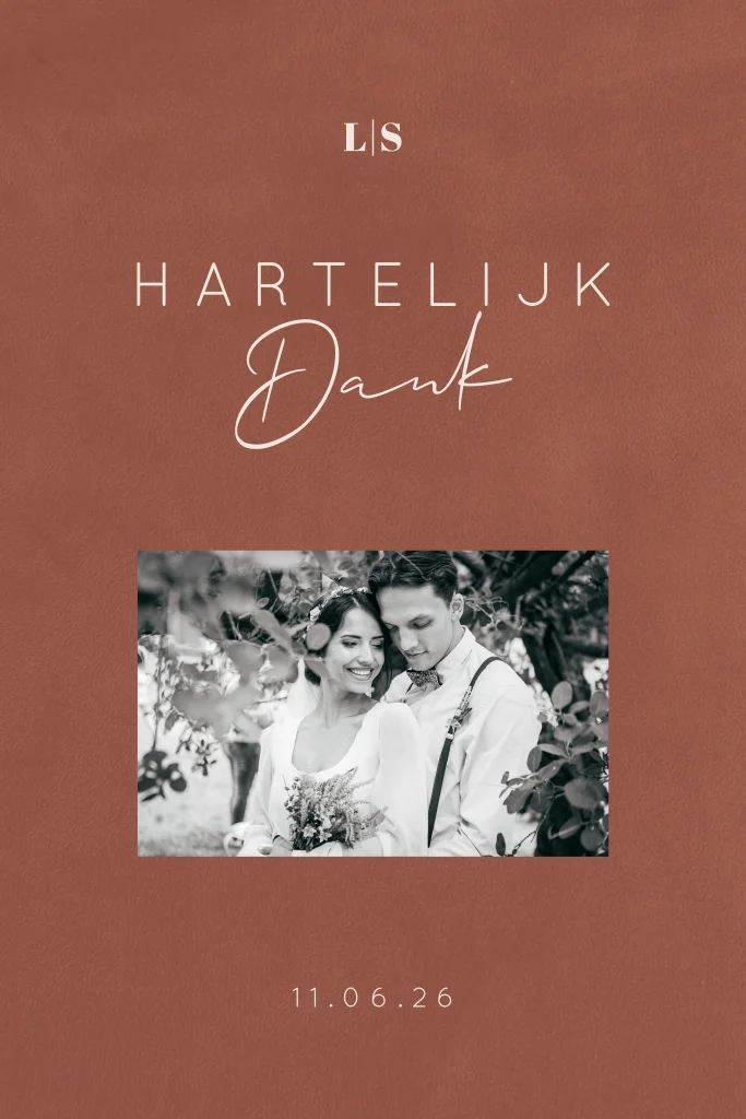Stijlvolle bedankkaart in roze/bruine velvetlook met de initialen van het bruidspaar. Op de voorkant is ruimte om een eigen foto te uploaden, de achterkant van de kaart is in bijpassende pastelkleur.