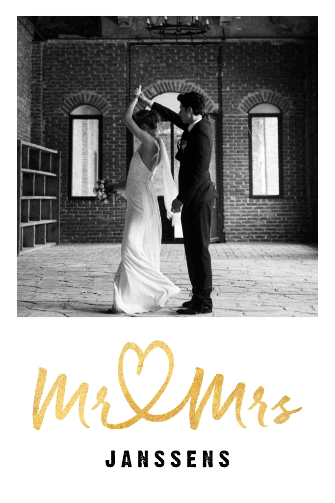 Maak een persoonlijk bedankje voor jullie bruiloftsgasten met deze fotokaart. Op de voorzijde is ruimte voor een eigen foto, eronder staat mr & mrs in goudkleur, de tekst op de achterzijde is in zwart en goud en kan eenvoudig zelf worden aangepast in de online editor.