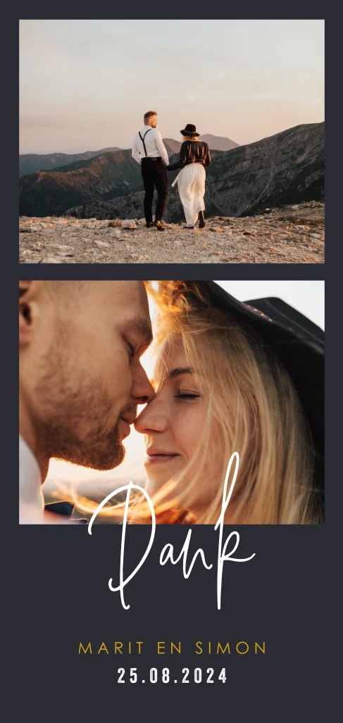 Moderne donkerblauwe kaart om de gasten van jullie bruiloft op een persoonlijke manier te bedanken. Aan de voorkant is ruimte om twee mooie foto's te uploaden met behulp van de online editor. De namen van het bruidspaar staan in goudfolie, dat heeft een luxe effect. Aan de achterzijde staat de bedank-tekst in wit met het silhouet van een dansend paar eronder.