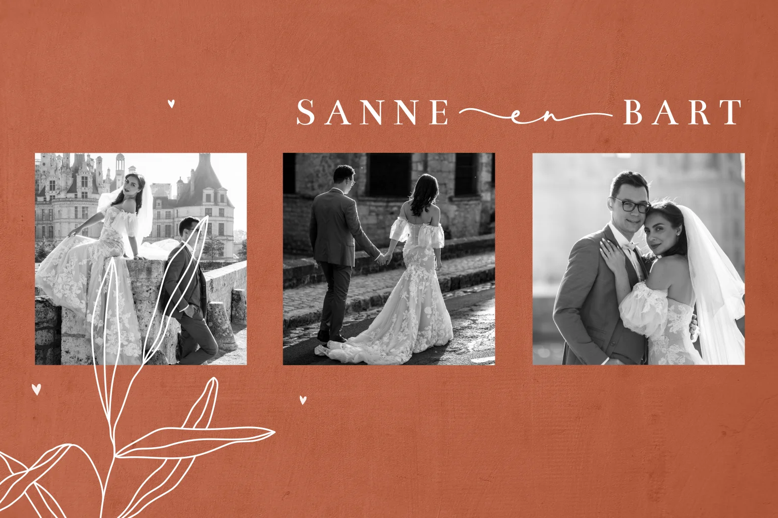 Mooie bedankkaart in dezelfde stijl als de trouwkaart, een mooie witte lijntekening van takjes op een roodbruine achtergrond. Je kunt drie foto's uploaden op de voorkant, de achterkant van de kaart is wit met bruine tekening van takjes.