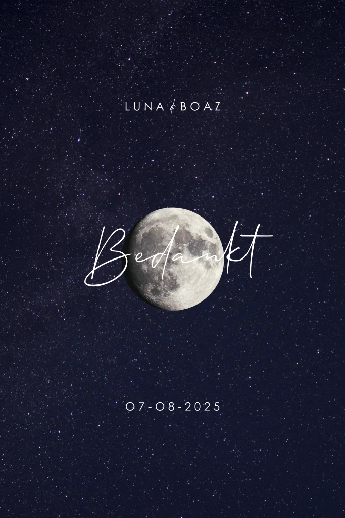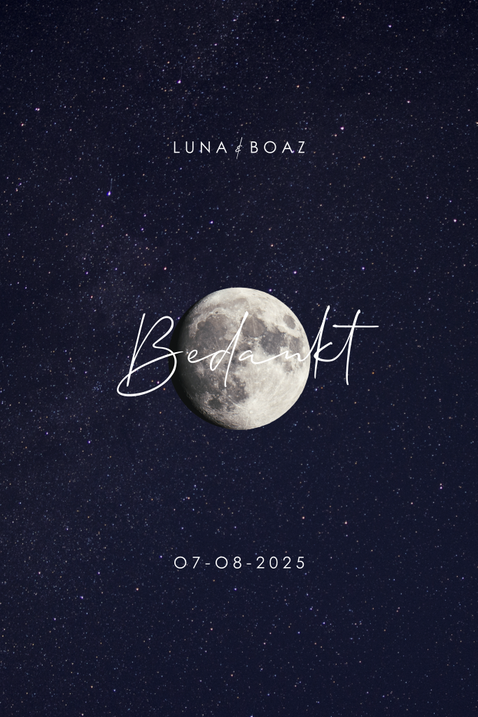 Donkerblauwe bedankkaart in de stijl van de trouwkaart, met afbeelding van een maan. 'Bedankt' staat in goudfoliedruk, dat geeft een extra luxe effect! Op de achterzijde is ruimte om een eigen foto toe te voegen, in de online editor maak je de kaart persoonlijk.