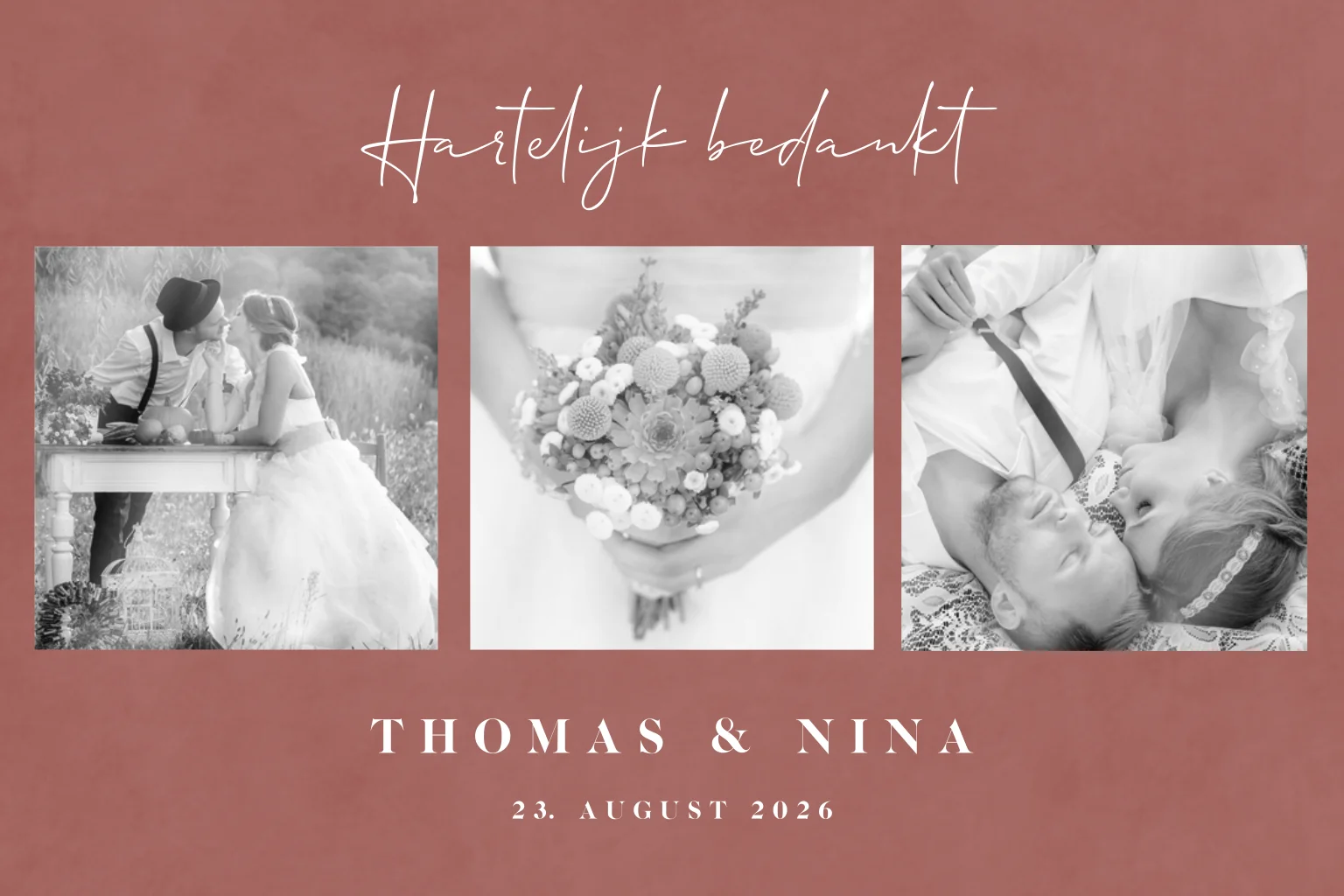 Bedank de genodigden van je bruiloft voor hun aanwezigheid met deze moderne bedankkaart. Laat 3 persoonlijke foto's op de voorkant van het kaartje toevoegen in onze online editor en maak de kaart zo extra bijzonder.