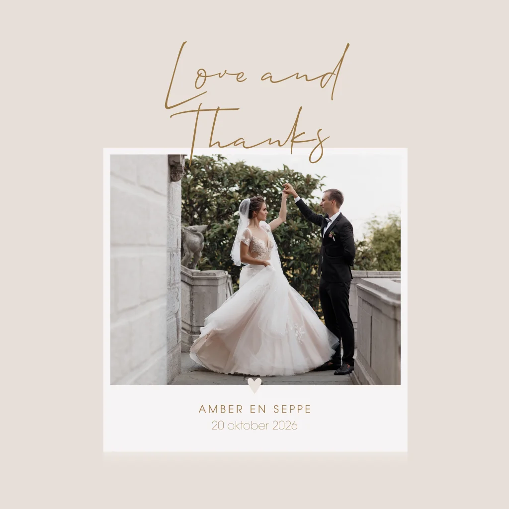 Stijlvol vierkant bedankkaartje met ruimte voor eigen foto op een zacht pastelroze achtergrond. De tekst is in zwart en zandkleur, ook op de witte achterzijde van deze kaart.
