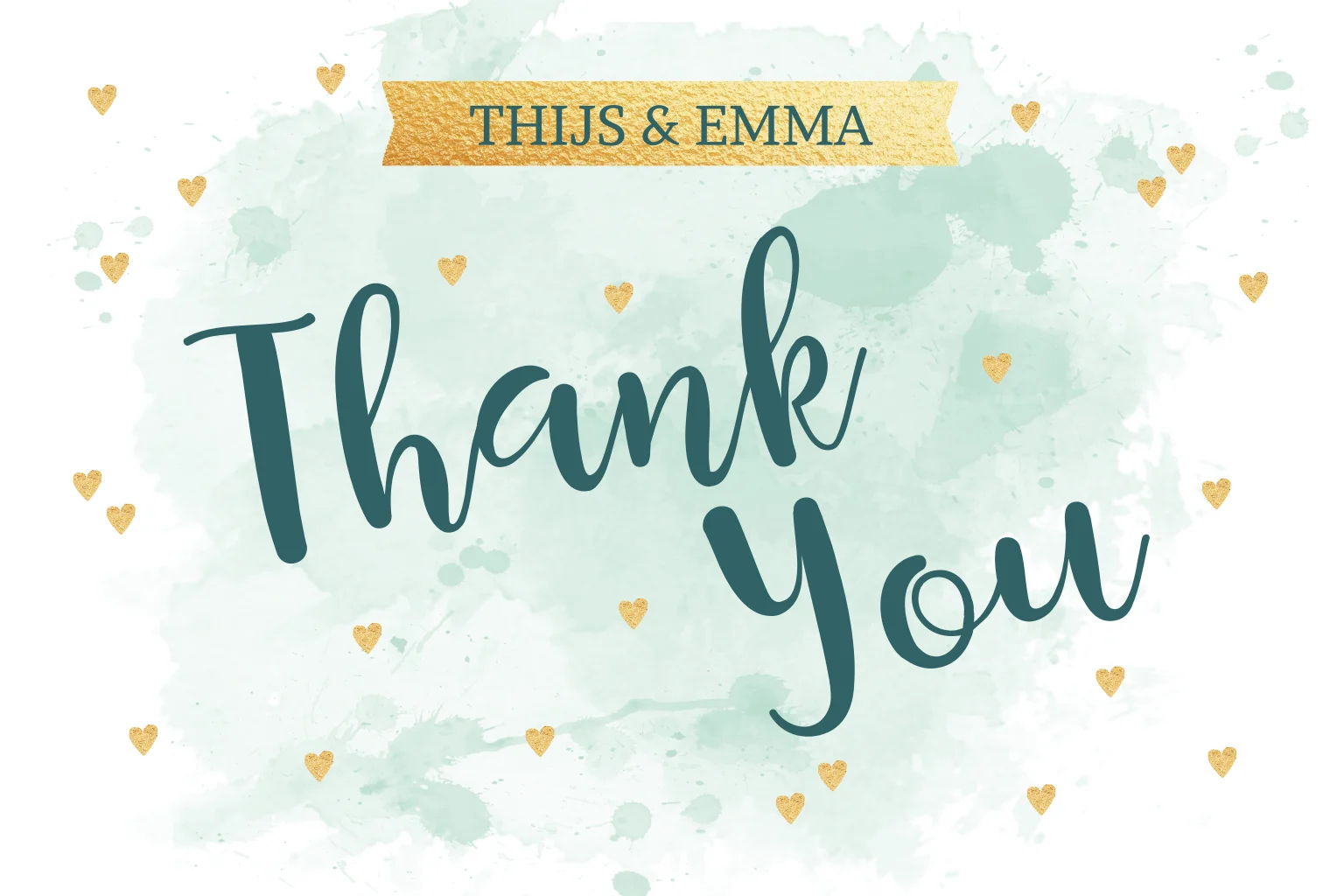 Wat een prachtige, mintgroene achtergrond van watercolour! In combinatie met de goudkleurige hartjes heeft hij een frisse, lieve uitstraling. Bedank jullie gasten met deze hippe bedankkaart!