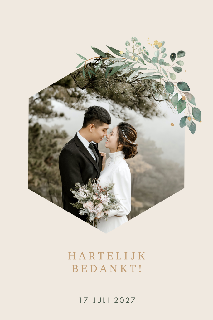 Stijlvolle bedankkaart in zachte pastelkleur met een watercolour groen takje boven de foto. In de zeshoek kun je met hulp van de ontwerptool de mooiste foto van jullie trouwdag plaatsen. Op de achterkant staat ook weer een takje bij de tekst.