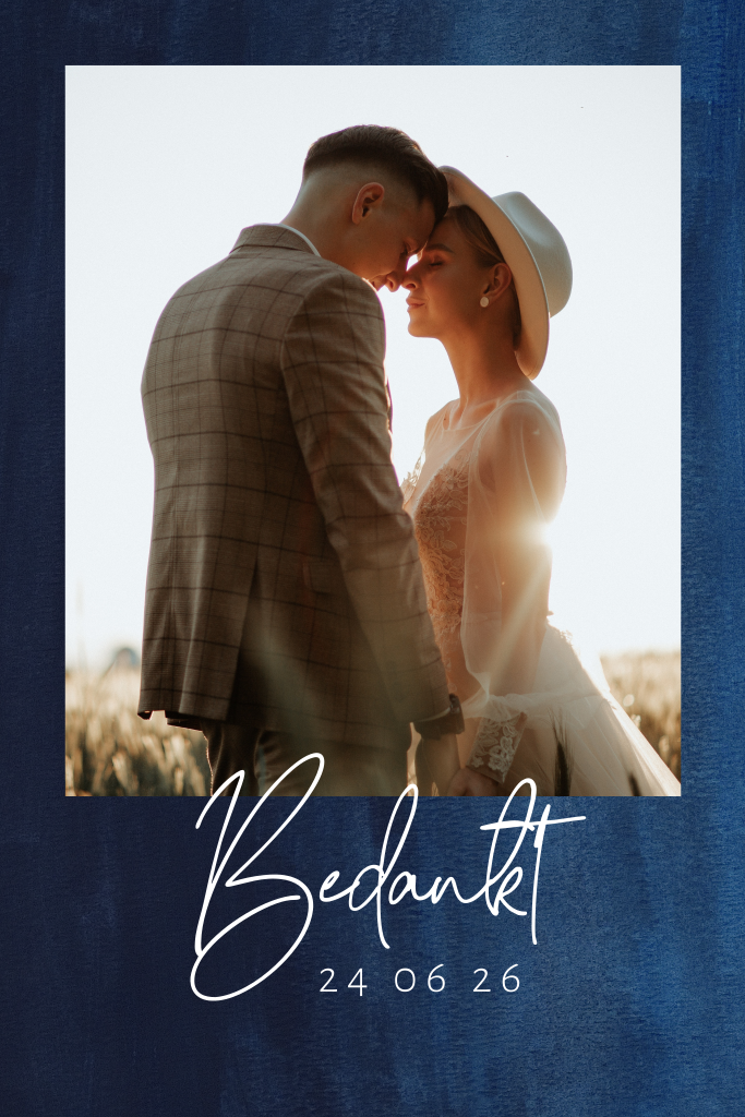Bedank de gasten van jullie bruiloft met deze stijlvolle donkerblauwe kaart. Op de voorzijde kun je een mooie foto uploaden, de tekst staat in roségoudfolie voor een extra luxe effect. De achterkant van de kaart is roze en de tekst is in trendy lettertypes, pas deze naar wens aan in de online editor.