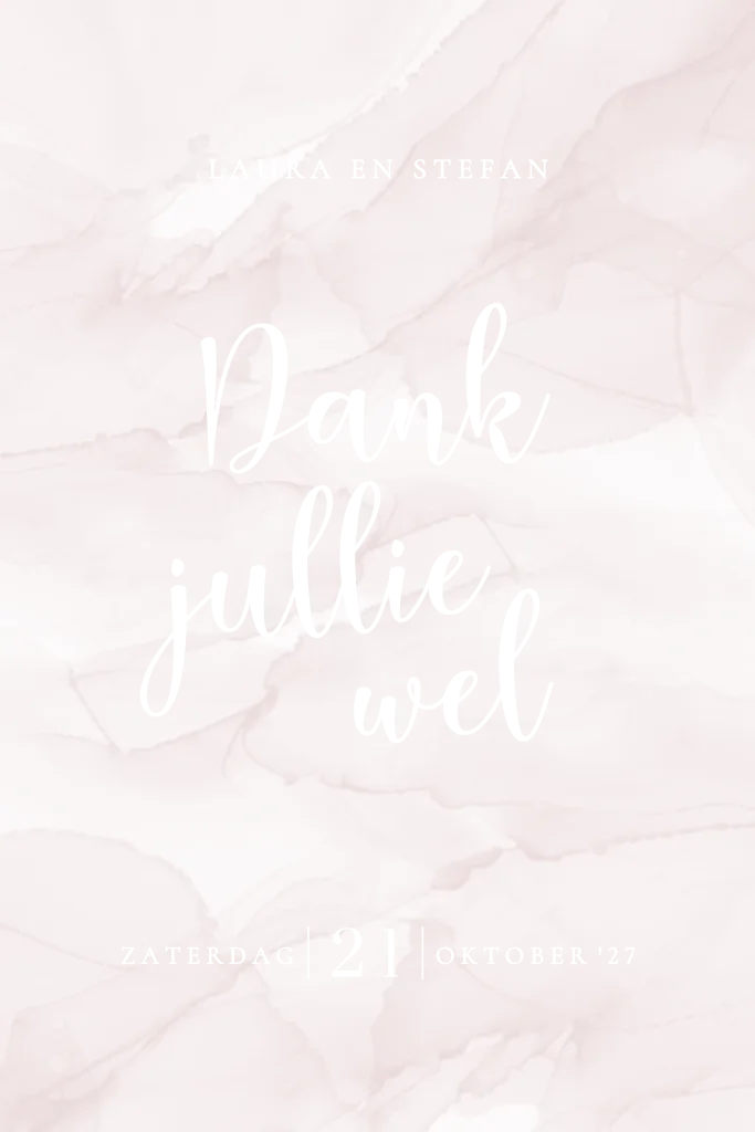 Romantische bedankkaart met een achtergrond van wit roze aquarel. De tekst staat in luxe roségoudfolie, ook op de achterkant komt de folie weer terug in de initialen van het bruidspaar.