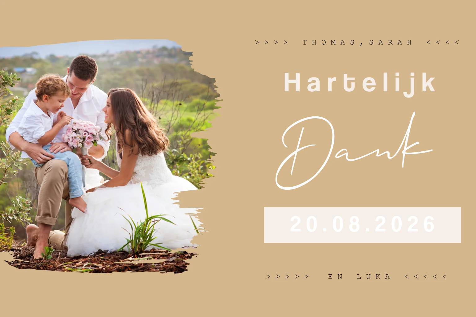 Bedank de gasten van jullie bruiloft met deze persoonlijke bedankkaart, op de voorkant is ruimte om een eigen foto te plaatsen in de vrije vorm. Op de zandkleurige kaart staat de tekst in verschillende lettertypes in goudfolie en wit en een leuke banner. Maak de kaart compleet in de online editor en verstuur deze in een bijpassende enveloppe met gouden inlay, dat maakt het helemaal af!