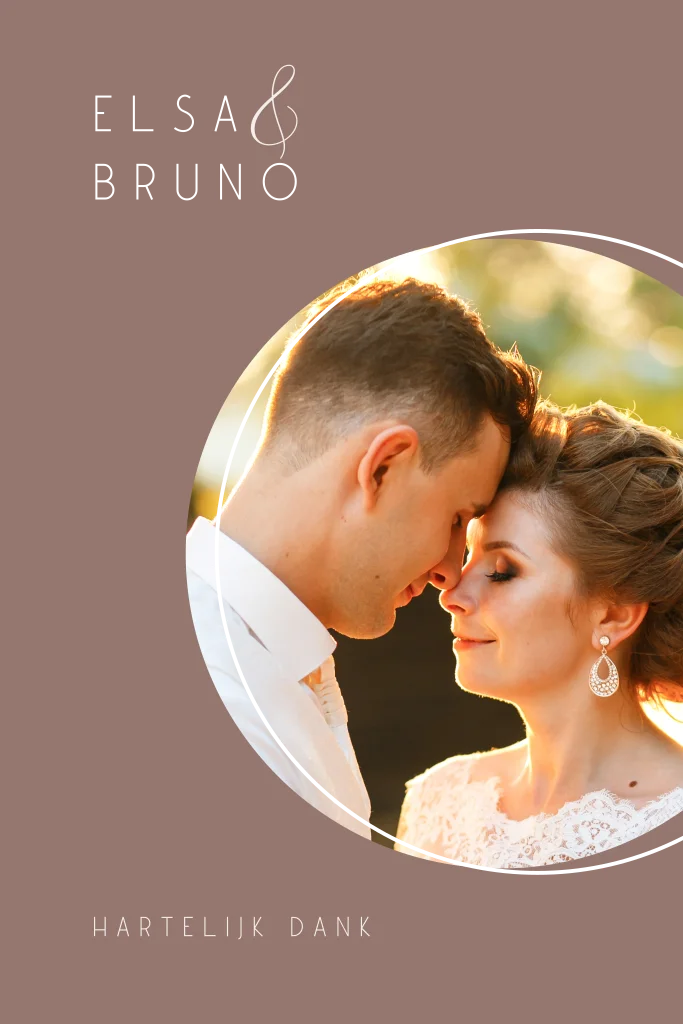 Bedank jullie bruiloftsgasten met deze chique bedankkaart in oudroze en afgeronde hoeken. In de halve cirkel is ruimte voor een mooie foto, de achterkant van de kaart is wit met bijpassende kleur tekst. Maak de kaart naar wens af in de online editor.