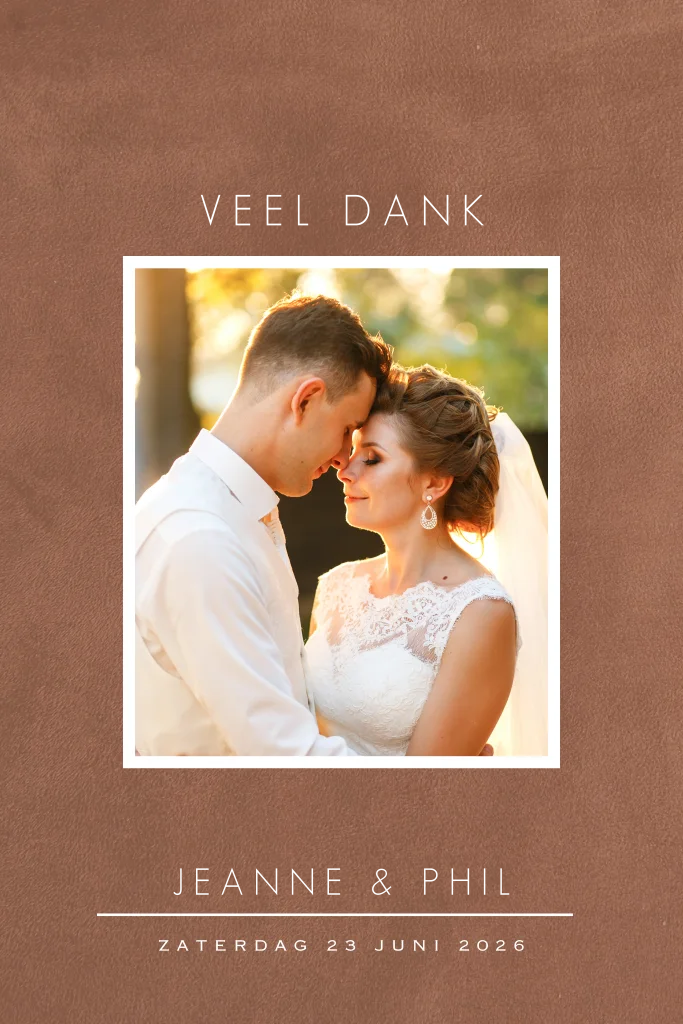 Stijlvolle kaart om de gasten van jullie bruiloft te bedanken: op een velvet look oudroze achtergrond is ruimte om een mooie eigen foto te uploaden. De tekst staat voor een deel in roségoudfolie en roze.