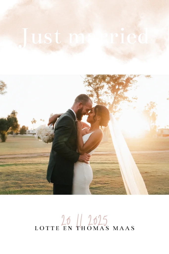 Maak een stijlvolle bedankkaart met een mooie eigen foto op de voorkant om de gasten van jullie bruiloft te bedanken. Boven de foto staat een roze waterverfvlak, ook op de achterzijde zie je roze aquarel met goudspetters. Upload een leuke foto en pas de tekst aan in de online editor voor een persoonlijk bedankje.