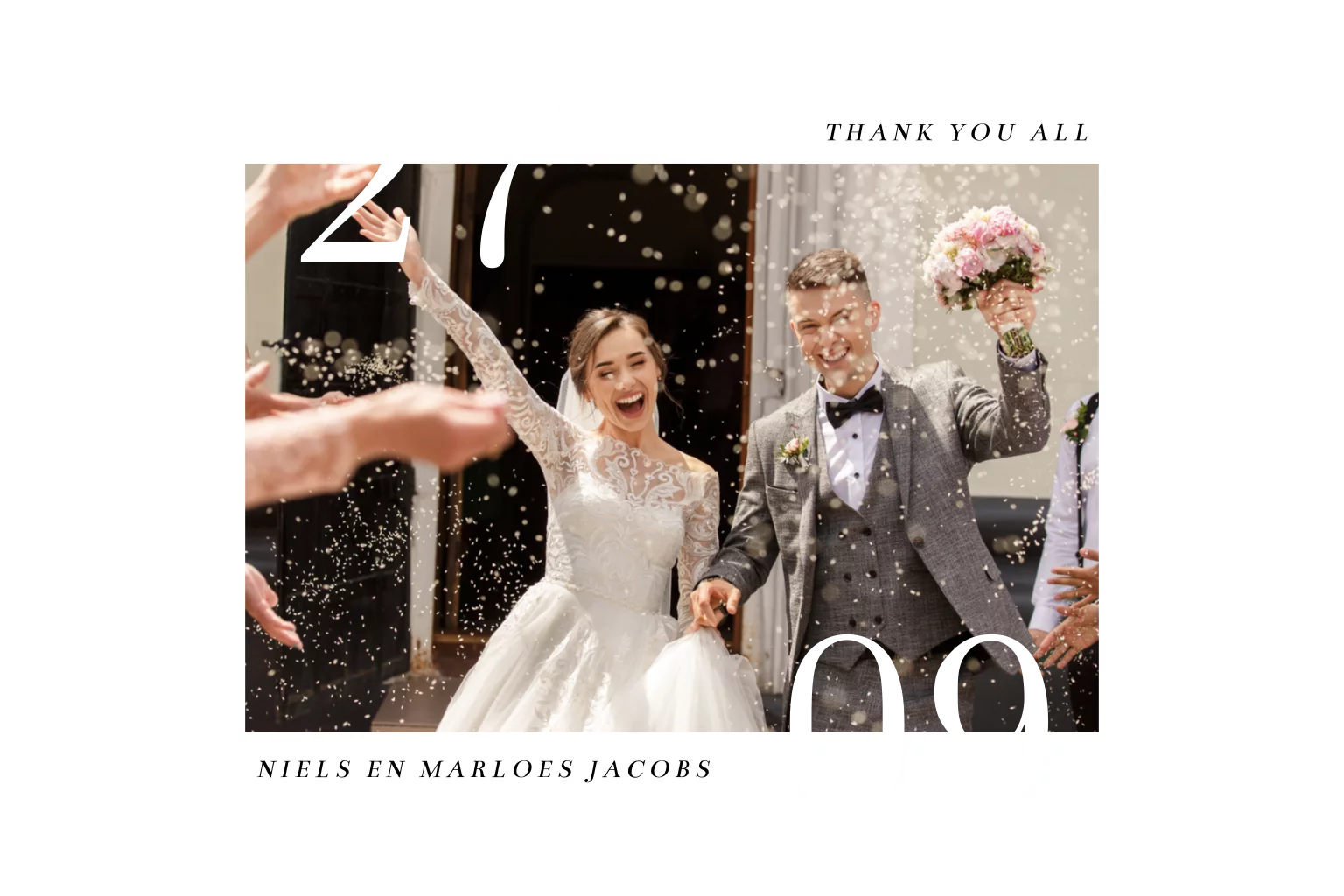 Maak een persoonlijk bedankje voor jullie bruiloftsgasten als herinnering aan jullie mooie trouwdag! Op deze leuke bedankkaart is ruimte voor een foto op de voorzijde, de tekst staat in luxe roségoudfolie en zwart, op de achterkant staat een gedeelte van de tekst in een peachroze vlak.