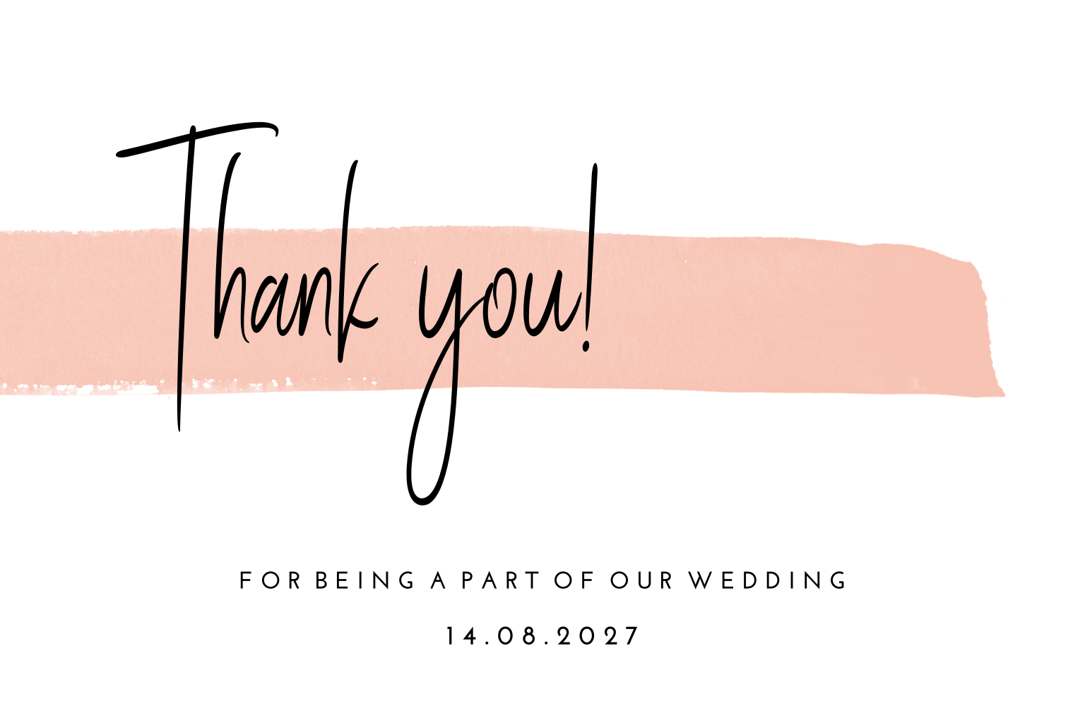Bedank jullie bruiloftsgasten met een kaartje in de stijl van de trouwkaart. Op deze witte kaart staat een roze verfstreep met 'thank you', de roze streep komt ook terug op de achterkant bij de namen van het bruidspaar.