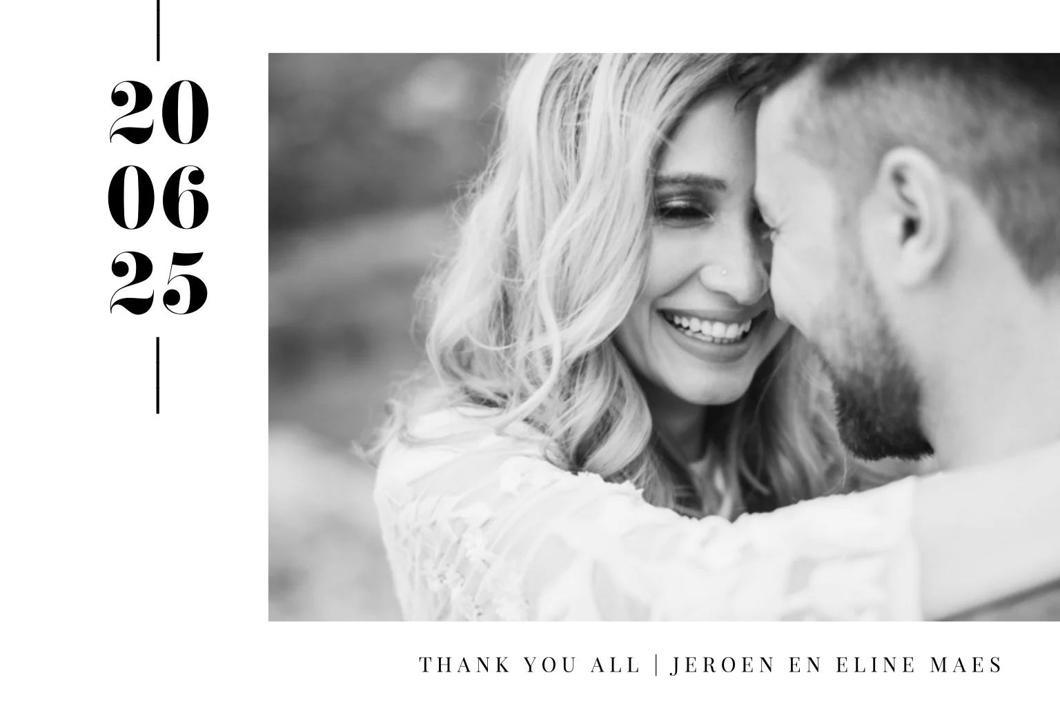 Maak een persoonlijk bedankje voor jullie bruiloftsgasten als herinnering aan jullie mooie trouwdag! Dit moderne kaartje is helemaal in zwart wit, pas het naar wens aan in de online editor.