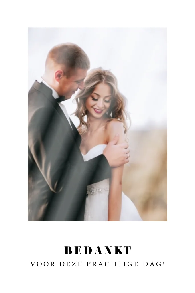 Bedank de bruiloftsgasten met een persoonlijke kaart: upload een mooie foto op de voorkant van deze witte kaart, de tekst staat in modern lettertype in zwart met een hartje eronder.