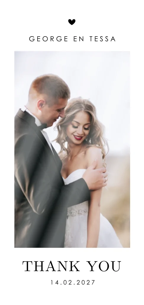 Een moderne langwerpige bedankkaart met een hoogglans foto om jullie liefde te vieren. Het subtiele hartje voegt een vleugje romantiek toe. Een stijlvolle manier om jullie dankbaarheid te tonen aan jullie bruiloftsgasten. In de online editor maak je de kaart helemaal naar eigen wens.