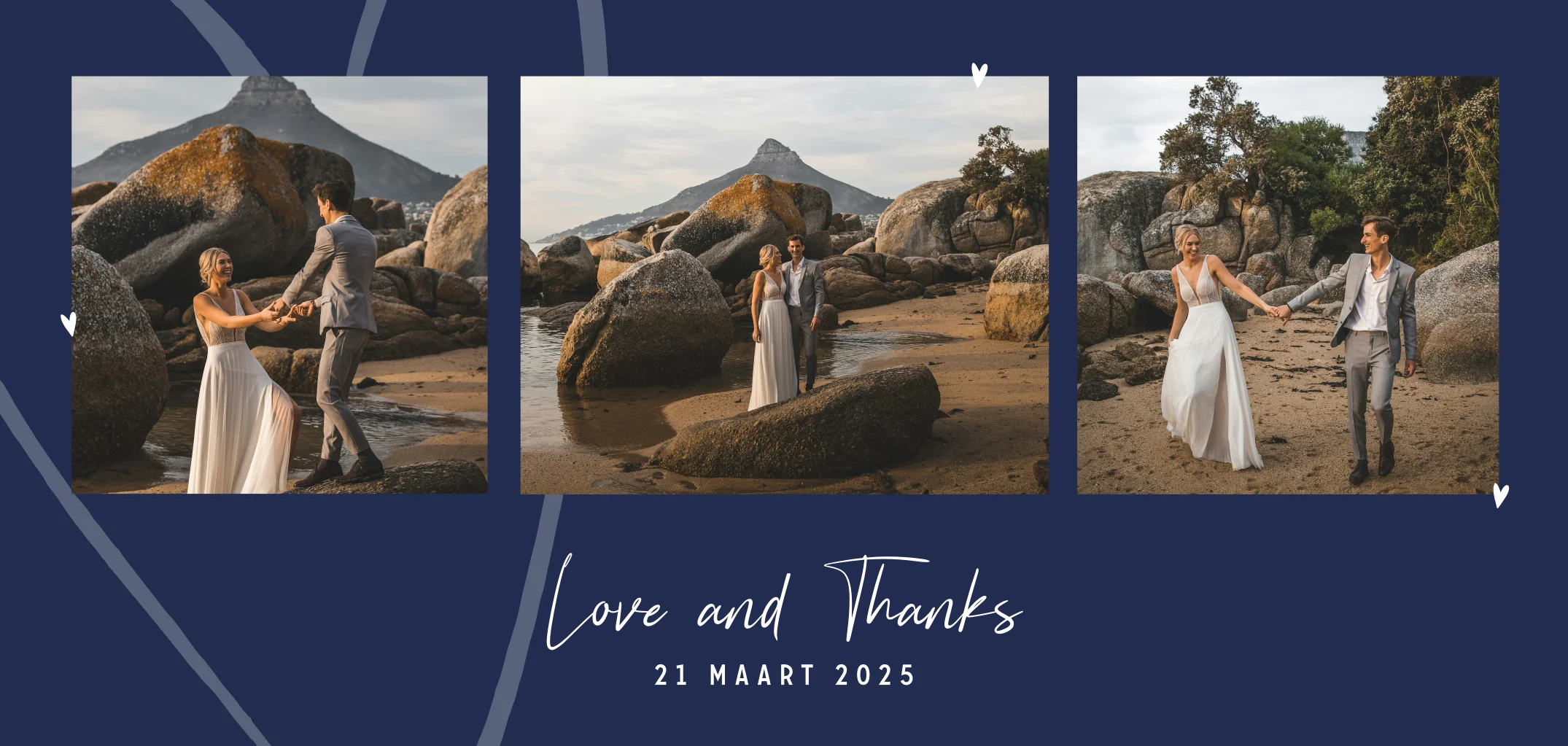 Panorama bedankkaart in blauw met hart en drie foto's.