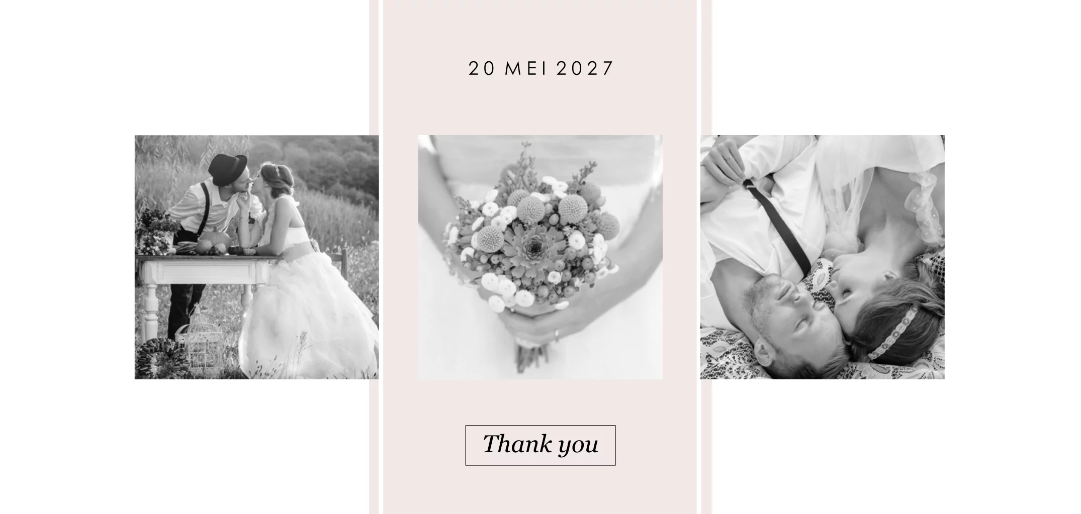 Deze klassieke bedankkaart is stijlvol en klassiek, en zal zeker indruk maken op jullie gasten. Op de roze met witte voorkant is ruimte voor drie persoonlijke foto's, De achterkant is zacht roze met zwarte tekst en een klein hartje. Ga aan de slag in de online editor en maak een mooi persoonlijk bedankje voor jullie gasten!