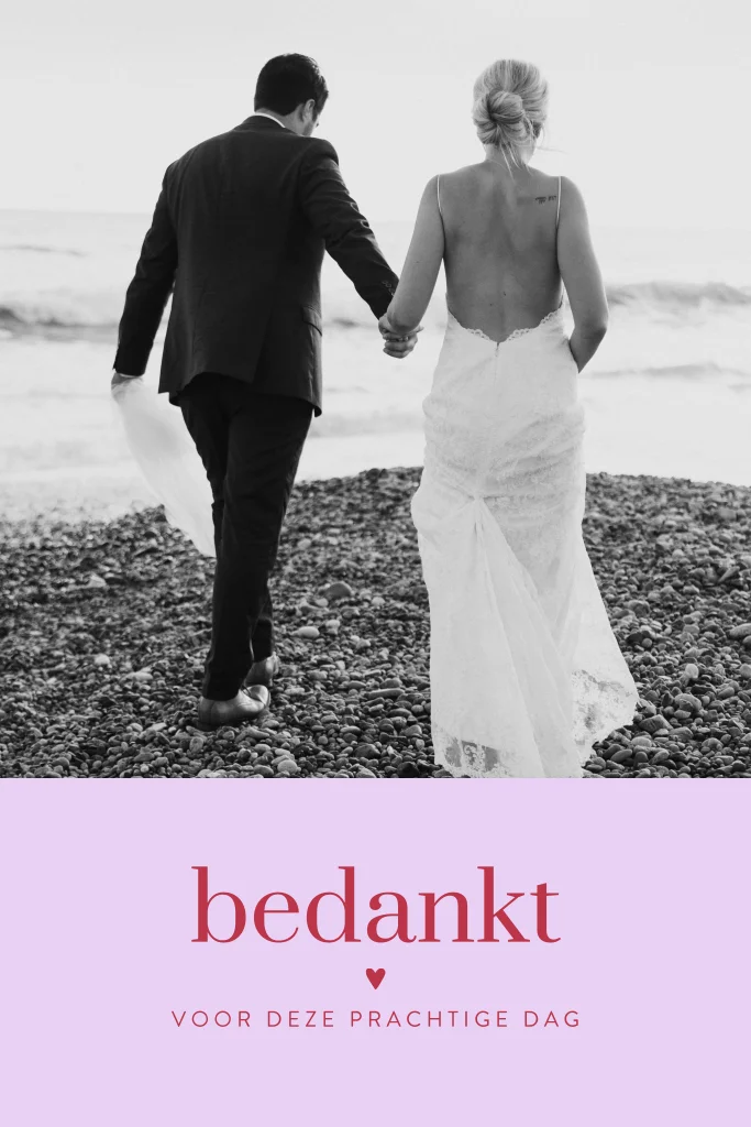 Bedank alle aanwezigen van jullie bruiloft met deze hippe en vrolijke bedankkaart in lila en fuchsiarood. Voeg een leuke foto toe en maak de kaart persoonlijk in de online editor.
