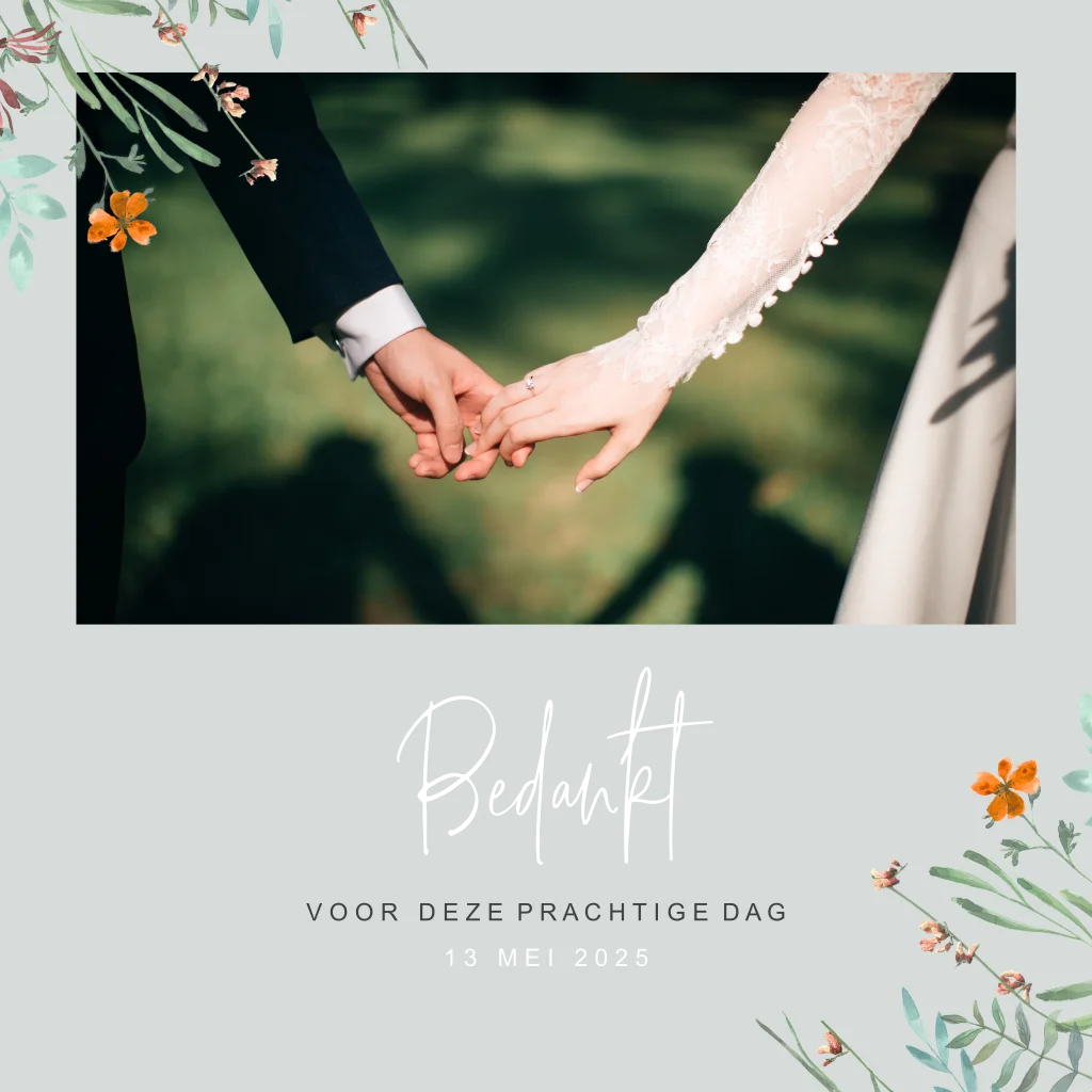 Deze bedankkaart past perfect bij de langwerpige trouwkaart met veldbloemen. Hier is gekozen voor een lichtgrijze achtergrond, de oranje met groene bloemen komen mooi uit zo. Op de voorkant is ruimte om een eigen foto te uploaden, de tekst 'bedankt' staat in luxe goudfolie.
