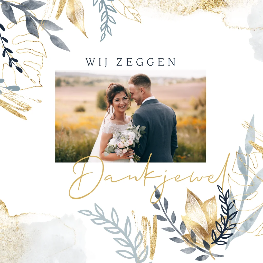Stijlvolle bedankkaart trouwen met bloemen in goud en blauw