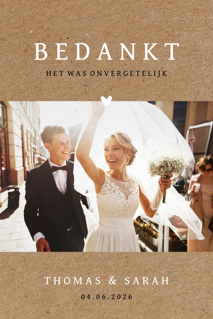 Bedank jullie bruiloftsgasten met deze bijpassende persoonlijke kaart in de stijl van de huwelijksuitnodiging. Op de kraft achtergrond komt de mooiste foto van jullie bruidsreportage en de tekst is in trendy zwarte letters. Een mooie kaart als aandenken aan jullie bruiloft voor familie en vrienden!