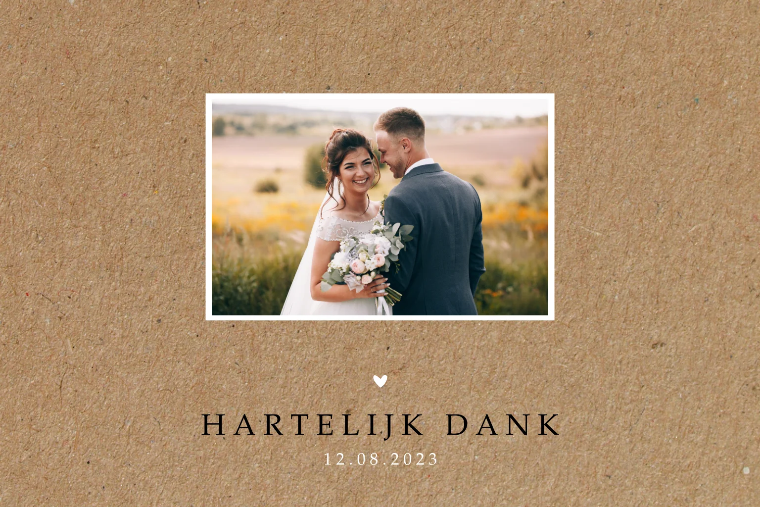 Maak een persoonlijk bedankje met deze bedankkaart in kraftlook en ruimte voor een eigen foto op de voorkant. Bij de tekst in verschillende lettertypes in zwart en wit staan kleine hartjes, pas de kaart naar wens aan in de online editor.