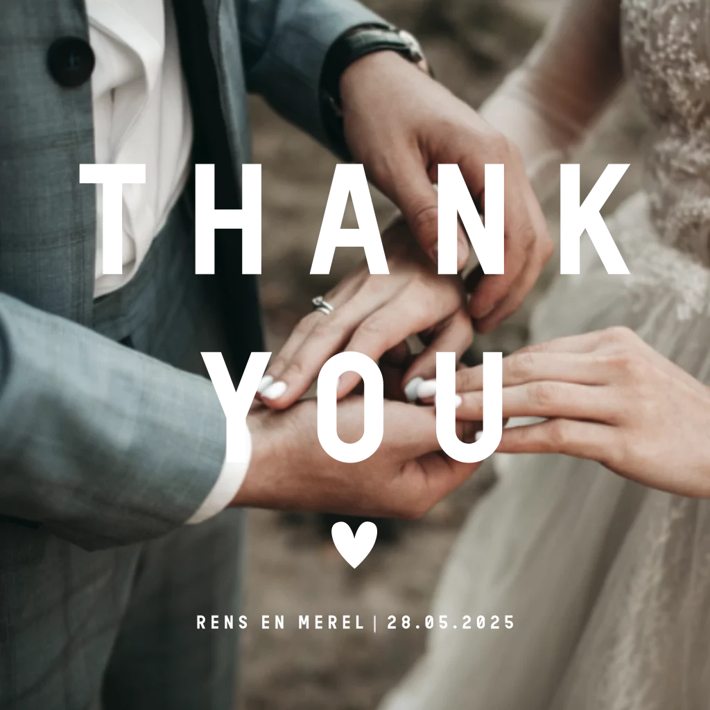 Maak een persoonlijk bedankje voor jullie bruiloftsgasten als herinnering aan jullie mooie trouwdag! 'Thank you'staat in luxe goudfolie met een romantisch hartje eronder.