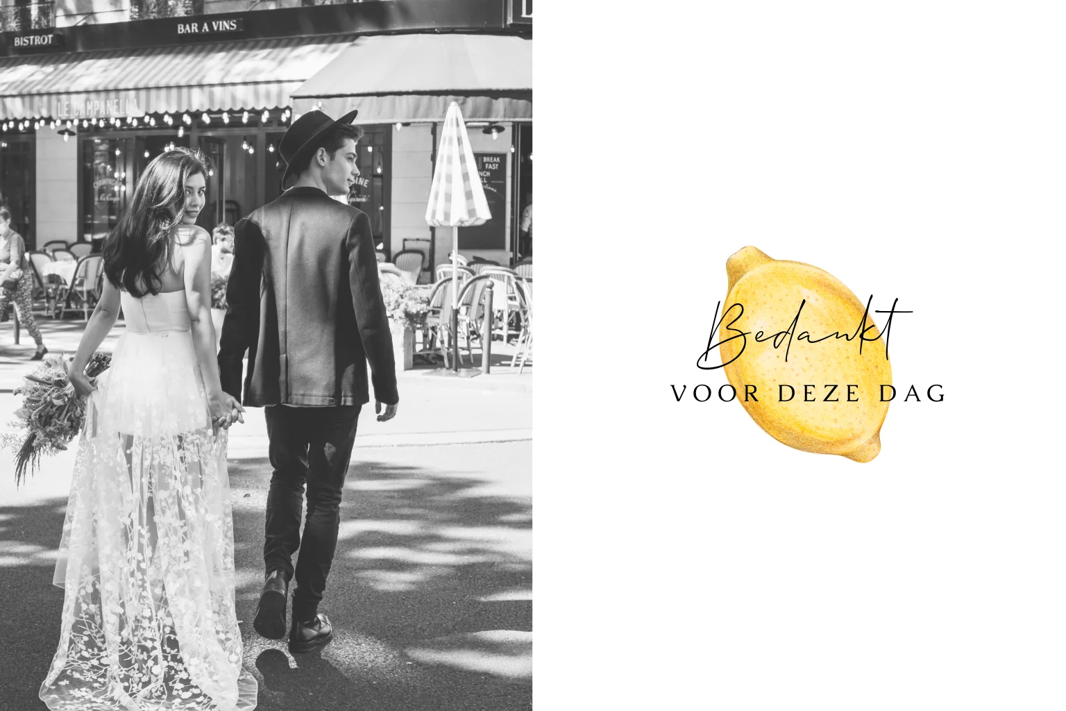 Maak een persoonlijk bedankje in de stijl van jullie trouwkaart om de bruiloftsgasten te bedanken. Op deze liggende kaart komt het design van de citroen terug, ook op de achterzijde staan 2 citroenen in de hoek en is een deel van de tekst geel. Upload jullie mooiste foto in de online editor voor op de voorkant en maak de kaart naar wens.
