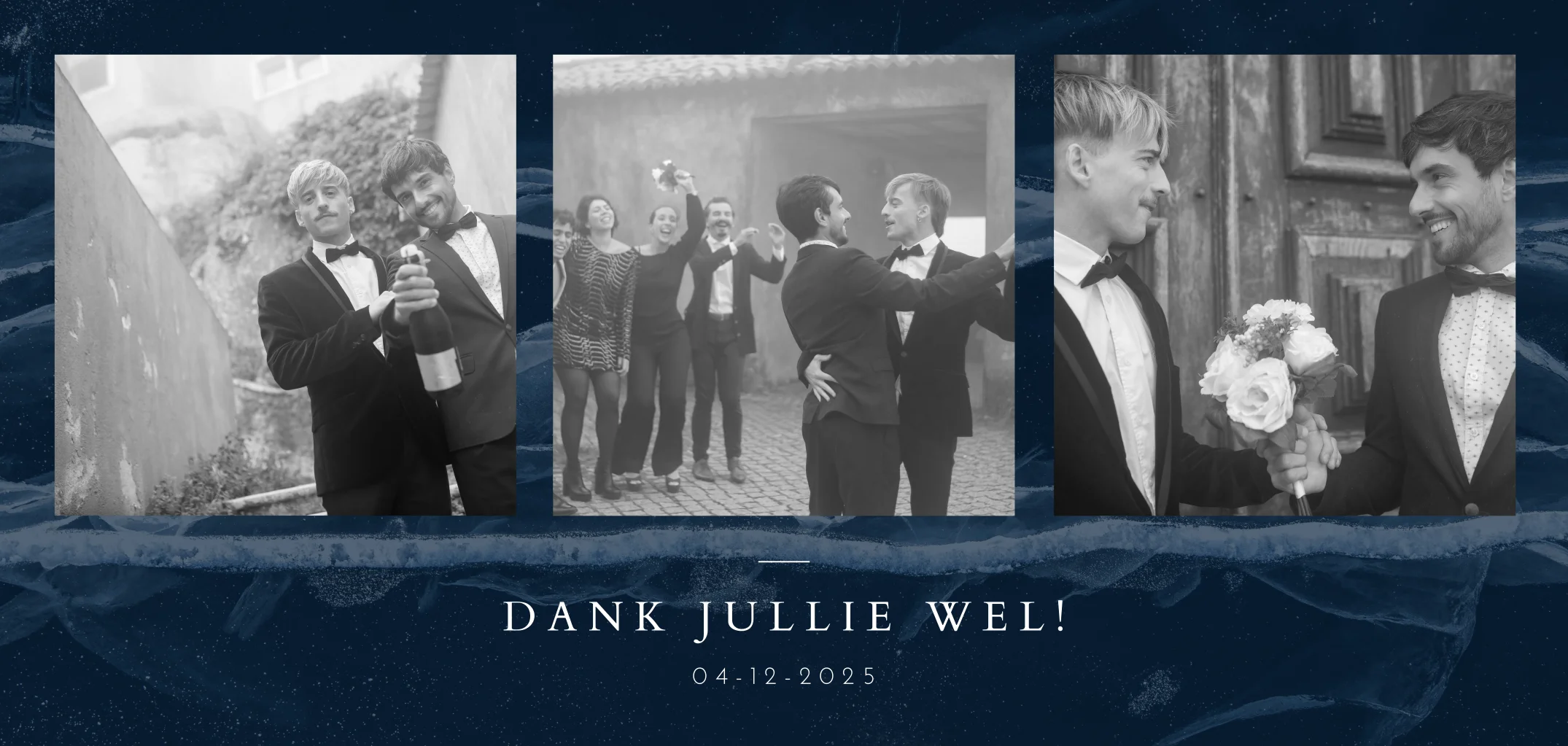 Een stijlvolle en hippe trouw bedankkaart in donkerblauw met marmereffect. Op de voorzijde is ruimte om drie foto's toe te voegen in polaroid stijl, op de achterzijde kan de bedank tekst, worden geplaatst, deze staat in modern wit lettertype. Maak het kaartje persoonlijk naar wens in de online editor.