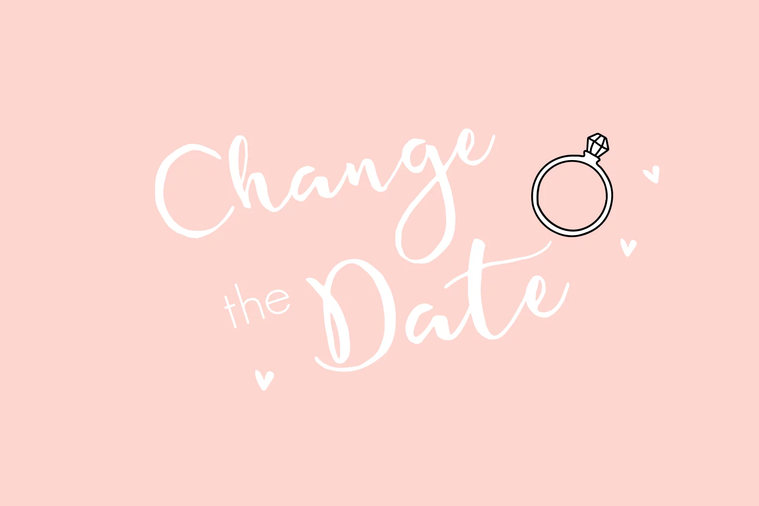Minimalistische, liggende change the date kaart met een ring en witte hartjes op een roze achtergrond. In de online editor kun je eenvoudig eigen tekst plaatsen.