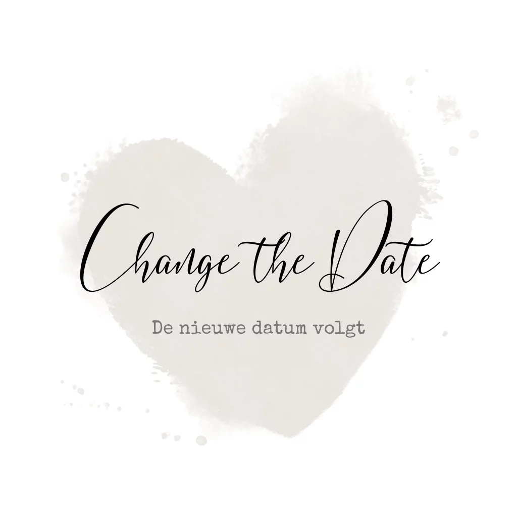 Zijn jullie genoodzaakt om jullie grote dag uit te stellen? Wat ontzettend vervelend, maar we denken graag met jullie mee. Stuur een kaart naar jullie gasten om dit te laten weten. Op de witte achtergrond is in het midden een lichtgrijs hart te zien met daarop de tekst in sierlijke zwarte letters.